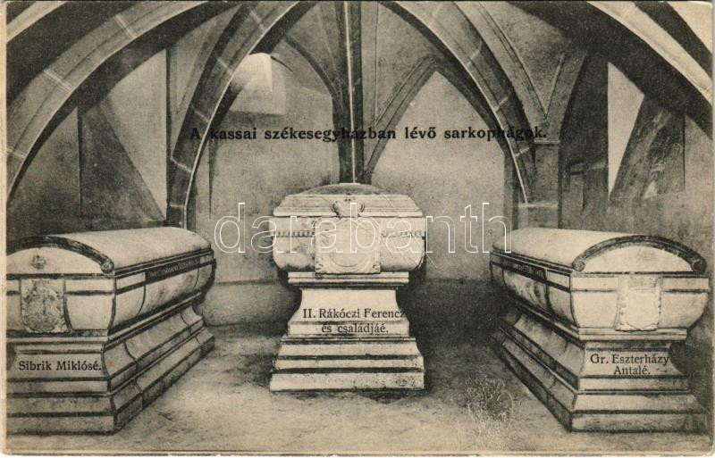 1910 Kassa, Kosice; A kassai székesegyházban lévő szarkofágok: Sibrik Miklósé, II. Rákóczi Ferenc és családjáé, Gróf Esterházy Antalé. Nyulászi Béla kiadása / sarcophagi in the cathedral