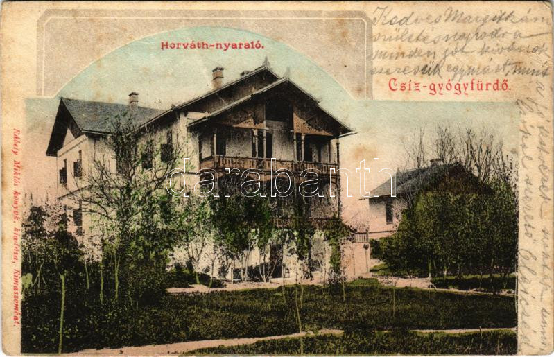 Beschreibung: Csíz, Csízfürdő, Kúpele Cíz; Horváth nyaraló. Rábely Miklós kiadása / villa, spa (Rb)