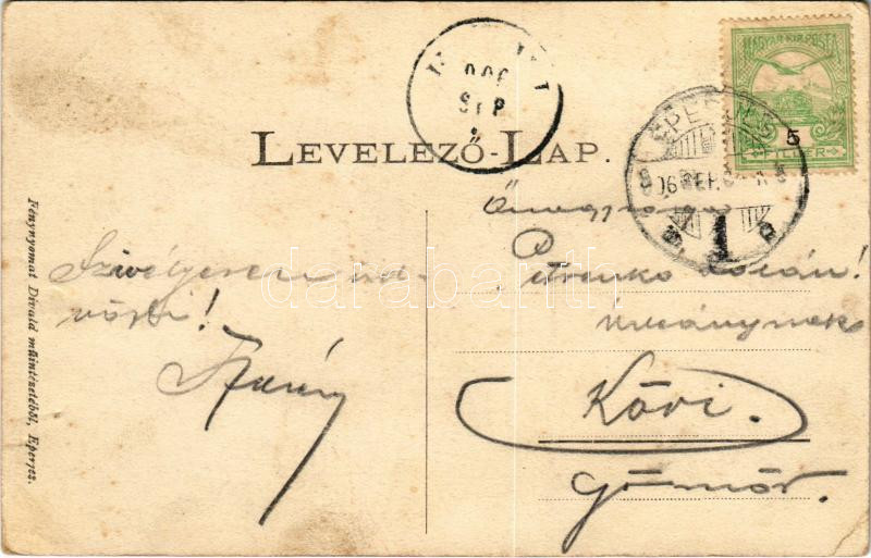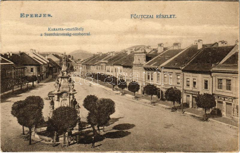 Eperjes, Presov; Fő utca, Karaffa vesztőhely, Szentháromság szobor, Klein Mór, L. Rosenwasser, Stamberger Lajos üzlete. Divald / main street, statue, shops (EK)