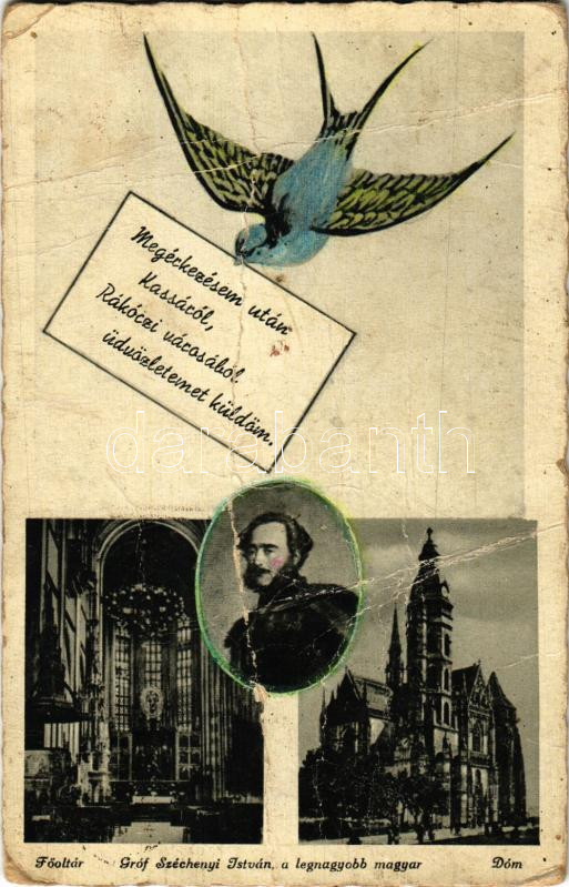 Kassa, Kosice; Dóm és főoltár, belső, Gróf Széchenyi István a legnagyobb magyar. Montázslap fecskével / cathedral interior, altar. montage postcard with swallow (gyűrődések / creases)