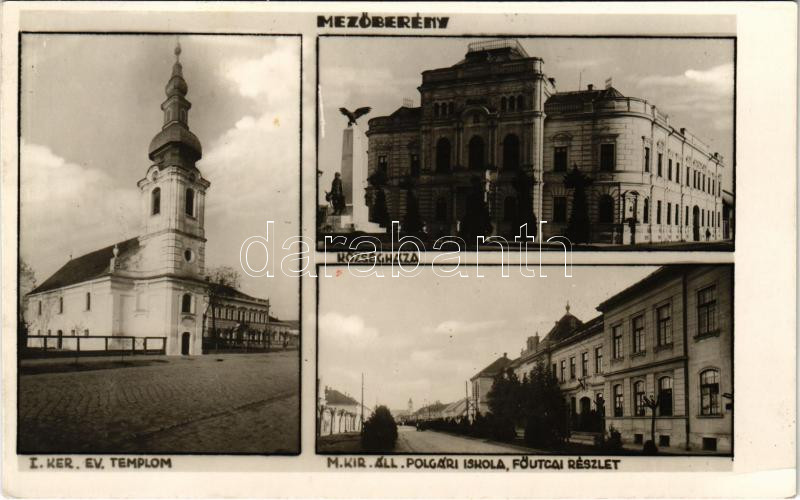 1948 Mezőberény, Evangélikus templom, Községháza, emlékmű, M. kir. áll... https://www.darabanth.com/de/435-Fernauktion/435.0/Ansichtskarten/Ungarn~2500004/1948-Mezobereny-Evangelikus-templom-Kozseghaza-emlekmu-M-kir-allami-polgari-iskola-~II2815980