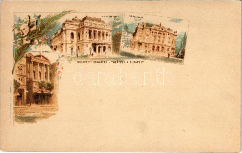 Beschreibung: Budapest, Ezredéves Országos Kiállítás, Budapesti színházak, Nemzeti Színház, Népszínház, M. kir. Operaház. litho barna 2 Kr. Ga. s: Cserna