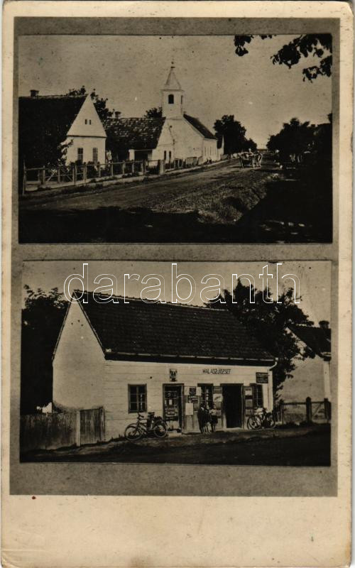 Beschreibung: Gelsesziget (Zala), utcakép templommal, Halász József üzlete kerékpárokkal (EK)