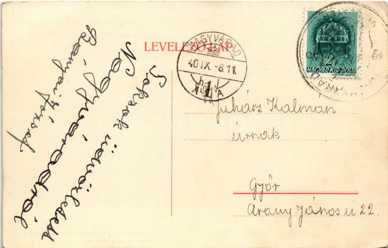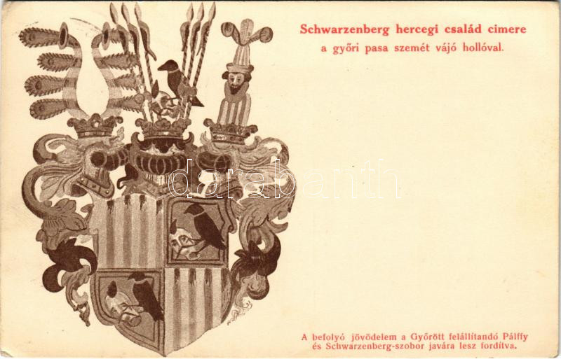 Győr, Schwarzenberg hercegi család címe a győri pasa szemét vájó hollóval. Segélylap a Pálffy és Schwarzenberg szobor javára + "1940 Nagyvárad visszatért" So. Stpl. (EK)