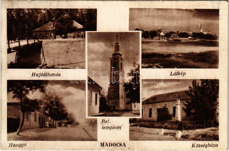 Beschreibung: Madocsa, hajóállomás, református templom, községháza, Hangya üzlete és saját kiadása