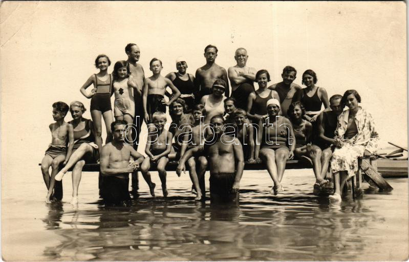 Beschreibung: Zamárdi, Balatonzamárdi; fürdőzők csoportképe a strandon. Schäffer Gyula fényképész, photo (EB)
