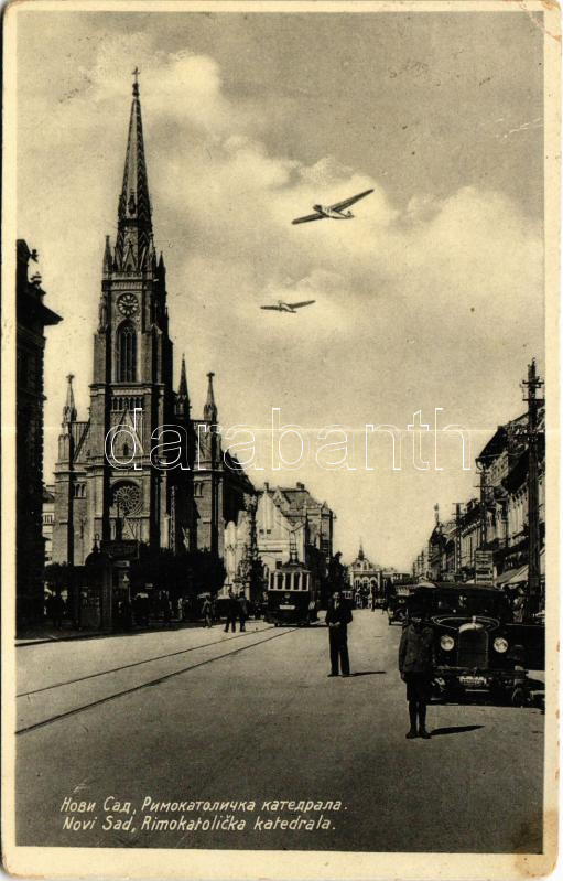 Beschreibung: 1932 Újvidék, Novi Sad; Rimokatolicka katedrala / Római katolikus székesegyház, villamos, automobil, repülőgépek / cathedral, tram, automobile, aircrafts (EK)