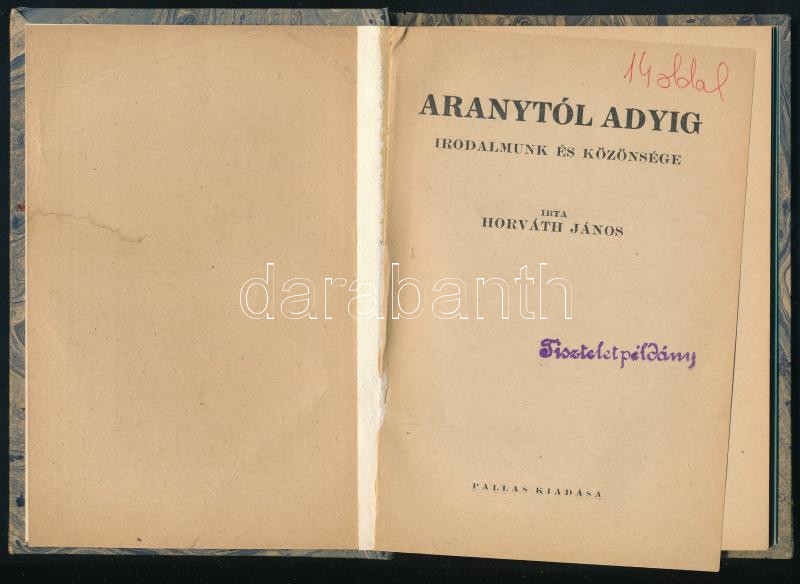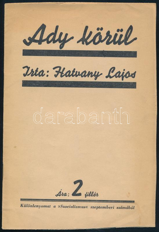 2 db Ady Endréhez és magyar irodalomtörténethez kapcsolódó könyv és nyomtatvány: Hatvany Lajos: Ady körül. Különlenyomat a "Szocializmus" szeptemberi számából. 14 p. Bp., é.n., Világosság-könyvnyomda. Kiadói papírkötés, alja vágott, lapok egy része sérült. + Horváth János: Aranytól Adyig - Irodalmunk és közönsége. Bp., é.n. Pallas. 59p. Későbbi kartonált papírkötésben, az eredeti papírborítót bekötötték, eredeti papírborítón javított szakadással, megerősített kötéssel, címlapon tiszteletpéldány bélyegzővel.