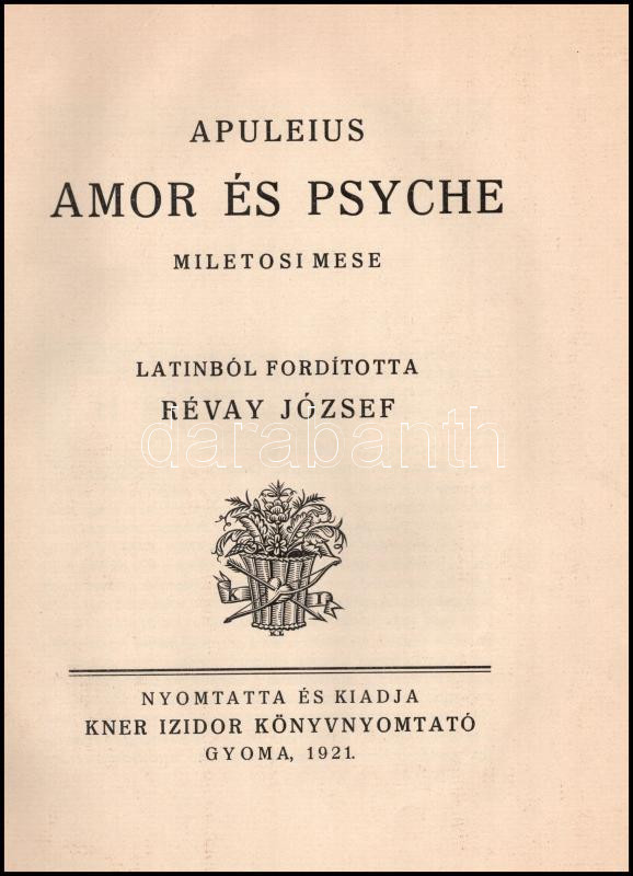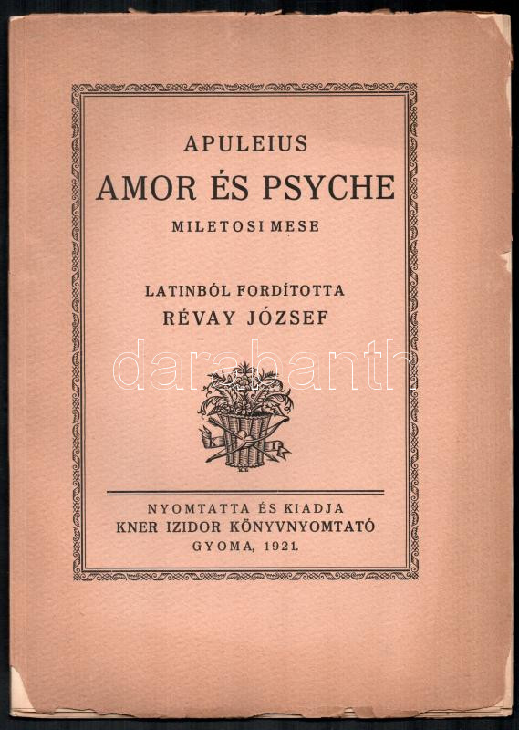 Apuleius: Amor és Psyche. Latinból fordította: Révay József. Monumenta Literarum I. sor. 2. szám. Gyoma, 1921., Kner Izidor. A könyvdíszek Kozma Lajos, a tipográfiai elrendezés Kner Imre munkái. Kiadói papírkötés, szakadozott, kissé sérült borítóval, kis részben felvágatlan lapokkal. Megjelent 600 példányban. Ez számozatlan példány.