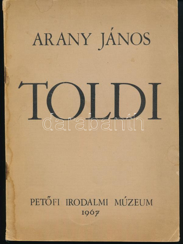 Arany János: Toldi. Bp., 1967., Petőfi Irodalmi Múzeum. Az OSZK Kézirattárának tulajdonában lévő eredeti kézirat hasonmása. Megjelent a költői születésének 150. évfordulójára, foltos gerinccel, a hátsó borítón kis sérüléssel, lyukkal, az utolsó lapon apró lyukkal. Kiadói papírkötés. Megjelent 1000 példány.