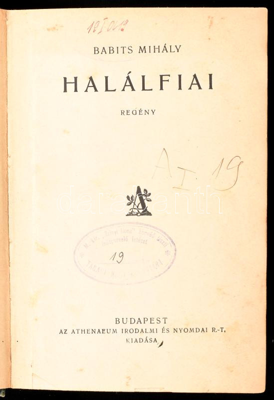 Babits Mihály: Halálfiai. Regény. Bp.,[1927], Athenaeum, 695+1 p. Első... https://www.darabanth.com/de/435-Fernauktion/435.0/Bucher/Bucher-Andere-kuriositaten~2000022/Babits-Mihaly-Halalfiai-Regeny-Bp-1927-Athenaeum-695plus1-p-Elso-kiadas-Atkotott-fel~II2793363
