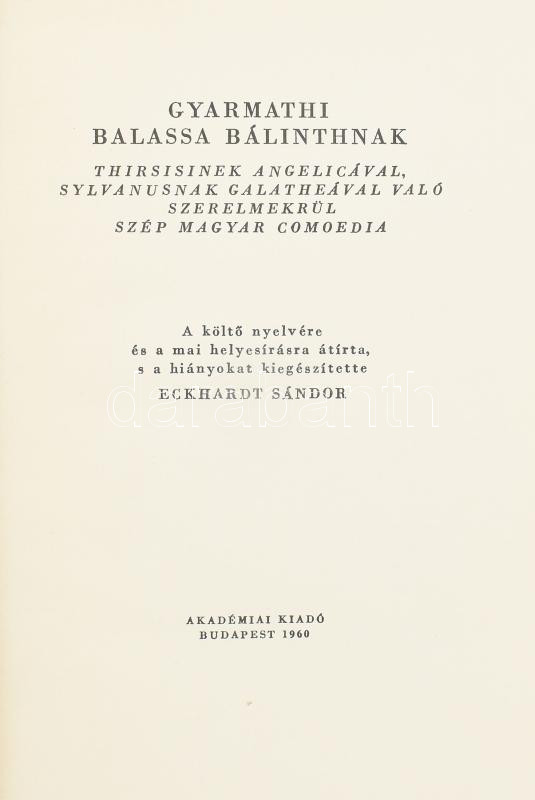 Balassi Bálint: Gyarmathi Balassa Bálinthnak Thirsisinek Angelicával, Sylvanusnak Galatheával való szerelmekrül szép magyar comoedia. A költő nyelvére és a mai helyesírásra átírta, s a hiányokat kiegészítette: Eckhardt Sándor. Bp., 1960, Akadémiai Kiadó. Kiadói aranyozott, bordázott gerincű félbőr-kötés, a gerincen kis sérülés és foltok, belül jó állapotban.