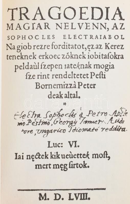 Bornemissza Péter: Tragédia magyar nyelven Szophoklész Élektrájából. "Tragoedia magyar nyelven, az Sophocles Electrájából. Nagiob rezre forditatot, ez az Kerezteneknek erkoeczőknek iobitasokra peldaúl szepen jateknek mogia szerint rendeltetet Pesti Bornemizzá Péter deak altal. M. D. LVIII." A fakszimile szövegét közzéteszi Kőszeghy Péter. Oláh Szabolcs tanulmányával. Bibliotheca Hungarica Antiqua XLII. Bp., 2009., Balassi - MTA Irodalomtudományi Intézete - OSZK. Az 1558-as kiadása fakszimile kiadása. Kiadói kartonált papírkötés.