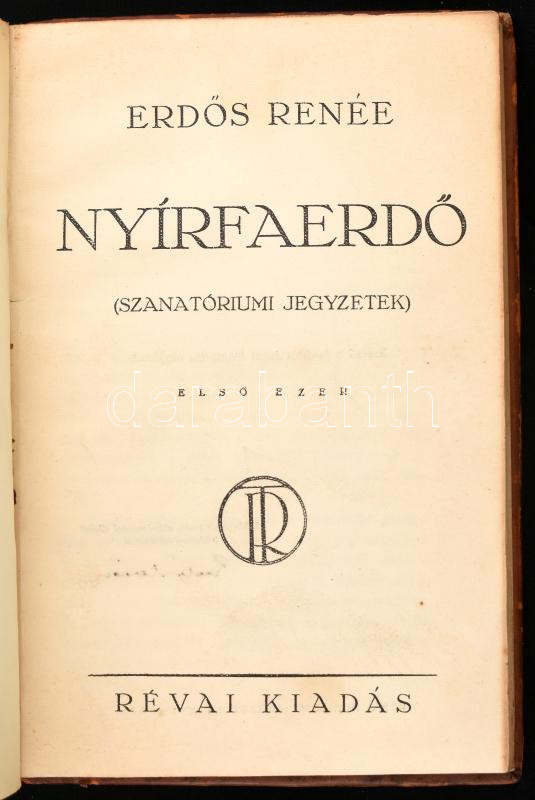 Erdős Renée: Nyírfaerdő. (Szanatóriumi jegyzetek). Bp., [1927], Révai, 160+(2) p. Egyedi egészbőr-kötésben, viseltes, kopott, sérült borítóval, ázásnyomokkal. A szerző által aláírt példány! Zsedényi Béla, az Ideiglenes Nemzetgyűlés elnökének könyvtárából, felesége tulajdonosi névbejegyzésével.