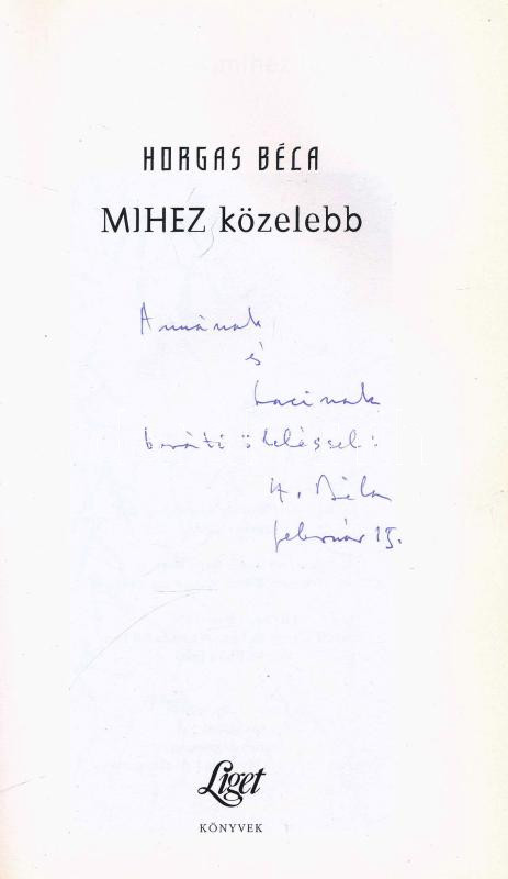Horgas Béla: Mihez közelebb. A szerző által DEDIKÁLT példány. [Bp.], 2... https://www.darabanth.com/de/435-Fernauktion/435.0/Bucher/Bucher-Andere-kuriositaten~2000022/Horgas-Bela-Mihez-kozelebb-A-szerzo-altal-DEDIKALT-peldany-Bp-2007-Liget-Muhely-A-~II2817601