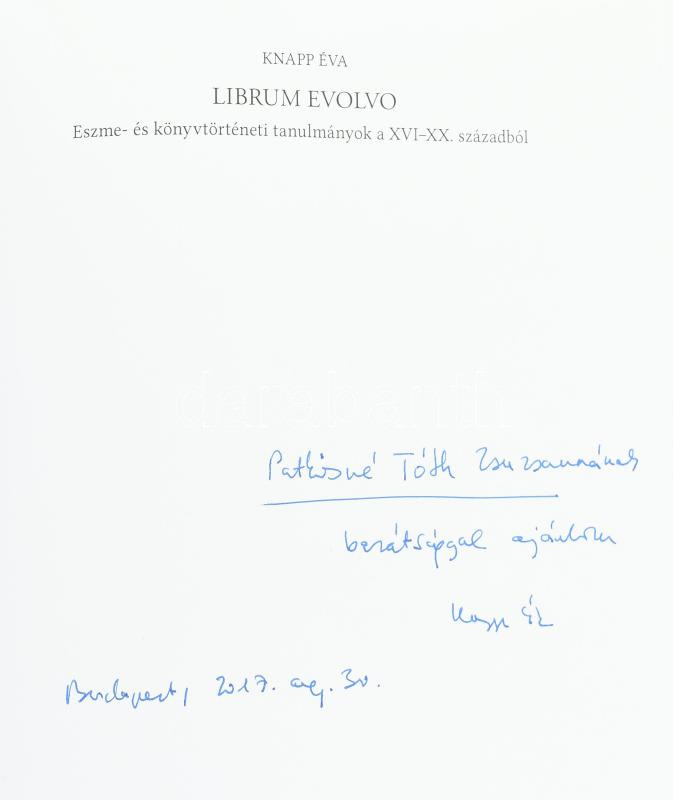 Knapp Éva: Librum Evolo. Eszme- és könyvtörténeti tanulmányok a XVI-XX. századból. A szerző, Knapp Éva (1956-) irodalomtörténész, könyvtörténész által DEDIKÁLT példány. Bp., 2017., Reciti, 319+1 p. Kiadói kartonált papírkötés.