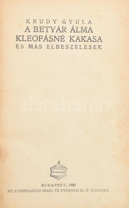 Krúdy Gyula: A betyár álma. Kleofásné kakasa és más elbeszélések. Bp., 1920., Athenaeum, 157+2 p. Első kiadás. Átkötött félvászon-kötés, kopott, sérült borítóval, laza fűzéssel.