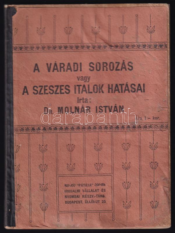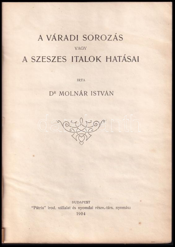 Molnár István: A váradi sorozás, vagy a szeszes italok hatásai. Bp., 1904, "Pátria", 68 p. Kiadói félvászon-kötés, kissé sérült borítóval. (Ritka alkohol-ellenesmunka a huszadik század elejéről, kedélyes asztali beszélgetés formájában, mely így zárul: "engedje megériök a magyarok Istene azt, hogy széles e hazában minden ember, ha már iszik, leginkább bort igyék, azt is mértékletesen.")