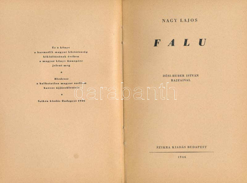 Nagy Lajos: Falu. Dési-Huber István rajzaival. Bp., 1946, Szikra. Első... https://www.darabanth.com/de/435-Fernauktion/435.0/Bucher/Bucher-Andere-kuriositaten~2000022/Nagy-Lajos-Falu-Desi-Huber-Istvan-rajzaival-Bp-1946-Szikra-Elso-kiadas-Kiadoi-papirko~II2812017