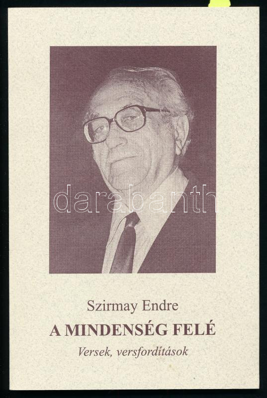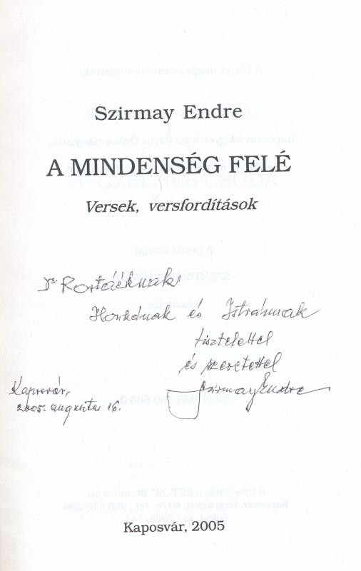Szirmay Endre: A mindenség felé. Versek, versfordítások. DEDIKÁLT! Kap... https://www.darabanth.com/de/435-Fernauktion/435.0/Bucher/Bucher-Andere-kuriositaten~2000022/Szirmay-Endre-A-mindenseg-fele-Versek-versforditasok-DEDIKALT-Kaposvar-2005-Szerzoi-~II2816706