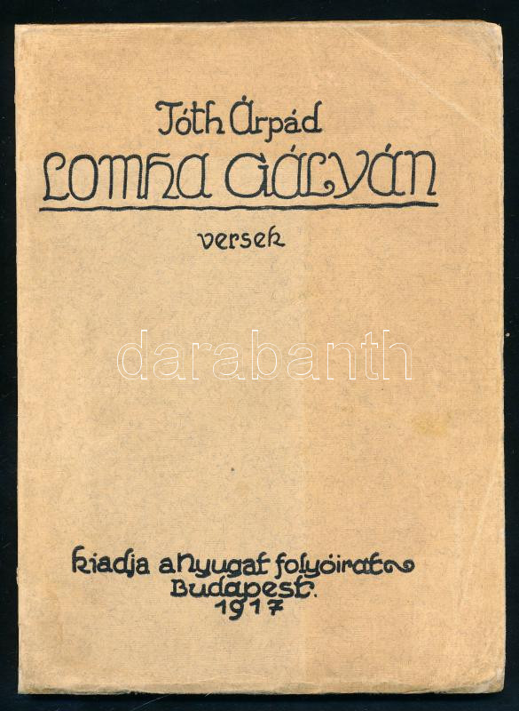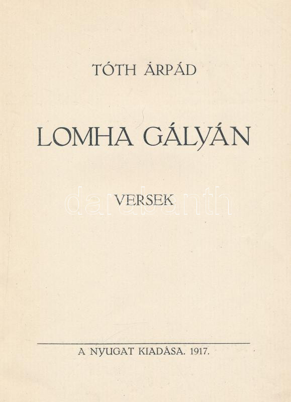 Tóth Árpád: Lomha gályán. Versek. Bp., 1917., Nyugat, 96 p. A költő második önálló kötetének első kiadása. Kiadói papírkötés, a gerincen javításnyomokkal, a borító gyűrődésnyomokkal, de alapvetően jó állapotban.