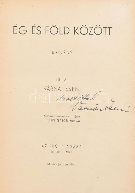Várnai Zseni: Ég és föld között. DEDIKÁLT! Bp., 1941, Szerzői kiadás. ... https://www.darabanth.com/de/435-Fernauktion/435.0/Bucher/Bucher-Andere-kuriositaten~2000022/Varnai-Zseni-Eg-es-fold-kozott-DEDIKALT-Bp-1941-Szerzoi-kiadas-Kiadoi-papirkotes~II2792378