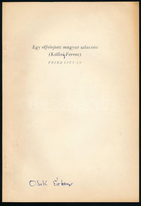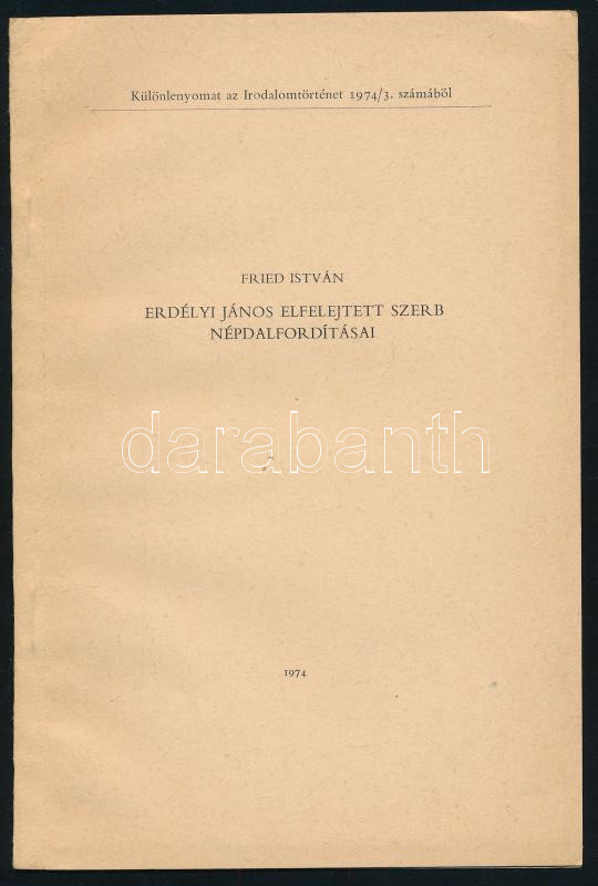 Vegyes szlavisztikai témájú tétel, 3 db: Fried István: Egy felfelejtett magyar szlavista (Kállai Ferenc.) A szerző, Fried István (1934-) irodalomtörténész által Zöldhelyi Zsuzsa (1928-2015) irodalomtörténész részére DEDIKÁLT példány. Különlenyomat az Országos Széchényi Könyvtár Évkönyvéből 1972. Bp., 1975., OSZK. Kiadói papírkötés.; Fried István: Erdélyi János elfeledett szerb népdalfordításai. Különlenyomat. Bp., 1974., Akadémiai Nyomda. Kiadói papírkötés.; Veszelinovich Magdolna: A délszláv népköltészet felfedezése a német és a magyar irodalomban. Bp., 1944., Danubia. Papírkötés.;