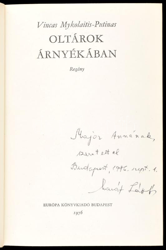 Vincas Mykolaitis-Putinas: Oltárok árnyékában. Regény. Ford.: Maráz László. A fordító, Maráz László (1926-1998) műfordító által Major Anna (1932-2021) dramaturg,a Szabó - család dramaturgja részére DEDIKÁLT példány. Bp.,1976., Európa. Kiadói egászvászon-kötés, kiadói papír védőborítóban.