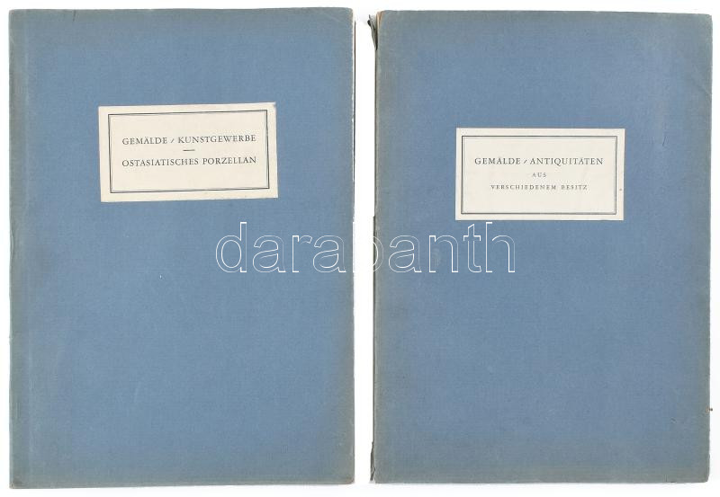 2 db német nyelvű művészeti katalógus: Gemälde / Kunstgewerbe aus verschiedenem Besitz - Ostasiatisches Porzellan [...] + Gemälde Plastiken / Antiquitäten aus verschiedenem Privatbesitz. Berlin, [1935-1936], Paul Graupe. Kiadói papírkötés, az egyik kötet részben kissé ázott, hullámos lapokkal.