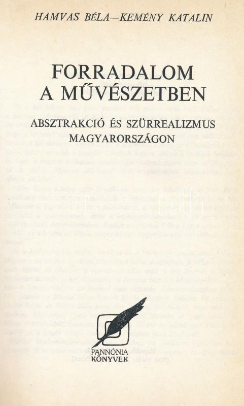 Hamvas Béla-Kemény Katalin: Forradalom a művészetben. Absztrakció és szürrealizmus Magyarországon. Bp., 1989., Pannónia. Második kiadás. A borító Lossonczy Tamás munkája. Kiadói papírkötés, jó állapotban.