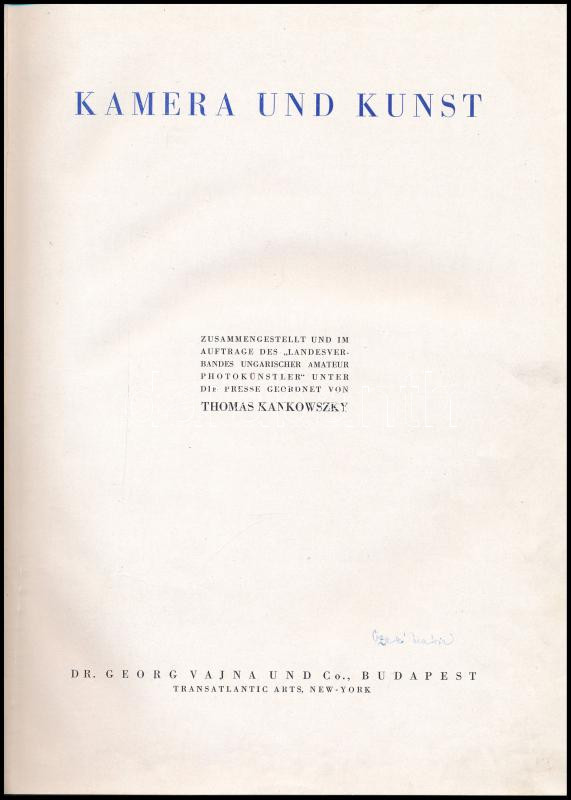 Kankowszky, Tamás: Kamera und Kunst. Bp., 1946., Georg Vajna und Co.,(New York, Transatlantic Arts-ny.), 12 p.+96 (fekete-fehér fotók) t. Német nyelven. Kiadói félvászon-kötés, kissé kopott borítóval, a képek alatt kézzel írt képcímekkel.