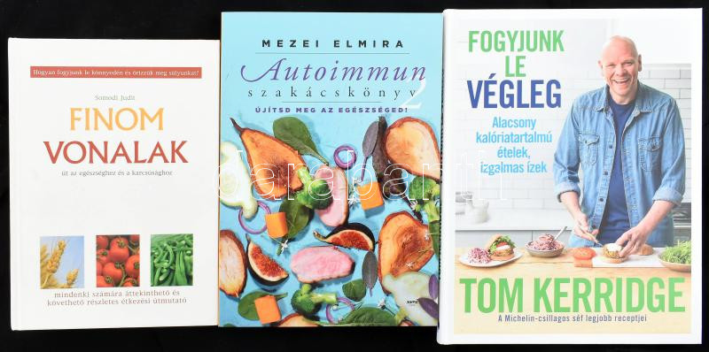 3 db könyv - Somodi Judit: Finom vonalak; Mezei Elmire: Autoimmun szakácskönyv; Kerridge, Tom: Fogyjunk le végleg. Kötetenként változó kötésben, jó állapotban.