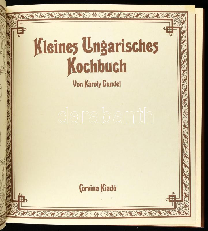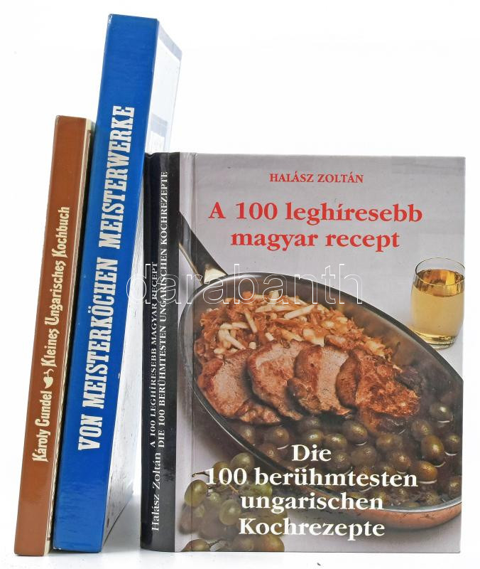 3 db szakácskönyv magyar ételekkel (egy magyar-német, két német nyelvű): Halász Zoltán: A 100 leghíresebb magyar recept / Die 100 berühmtesten ungarischen Kochrezepte; Gundel Károly: Kleines Ungarisches Kochbuch; Von Meisterköchen Meisterwerke. Kiadói kartonált papírkötés.
