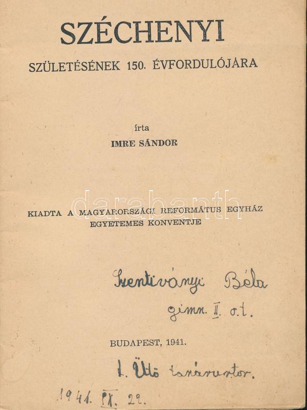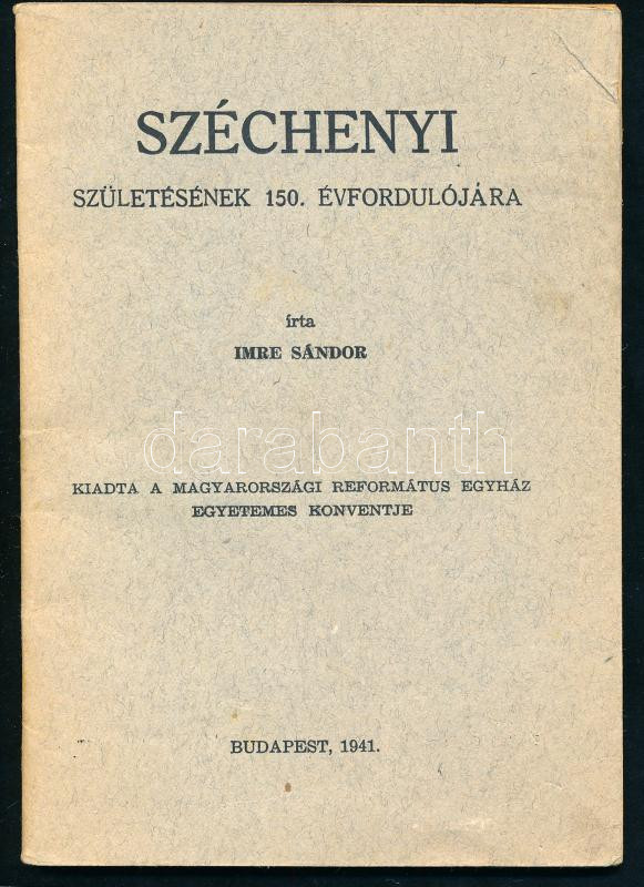 Imre Sándor: Széchenyi születésének 150. évfordulójára. Bp., 1941, Magyarországi Református Egyház Egyetemes Konventje. Kiadói papírkötés, tulajdonosi bejegyzéssel, jó állapotban.