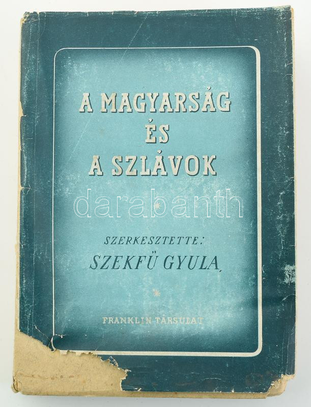 Szekfű Gyula: A magyarság és a szlávok. Szerk.: - -. Divéky Adorján, Fügedi Erik, Gogolák Lajos, Gunda Béla, Hadrovics László, Kniezsa István, Lukinich Imre, Thim József, Trócsányi Zoltán, Zsirai Miklós. Bp., 1942, Kir. M. Pázmány Péter Tudományegyetem Bölcsészeti Karának Magyarságtudományi Intézete, (Franklin-ny.), 278+1 p.+4 térkép +2 t. Kiadói papírkötés, kiadói papír védőborítóban, a papír védőborító kettészakadt, hiányos, a gerincen kis hiány, a borítón kis szakadással és egyik sarkán kis hiánnyal.