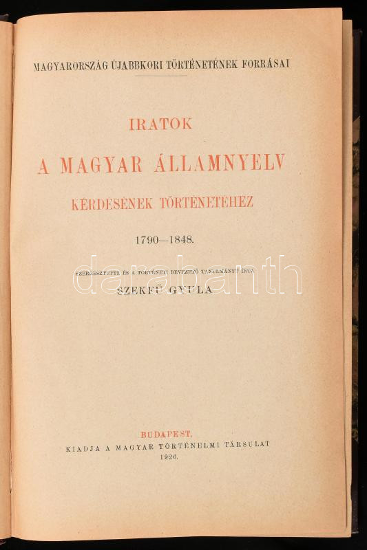 Szekfű Gyula: Iratok a magyar államnyelv kérdésének történetéhez. 1790-1848. Szerk. és a történeti bevezető tanulmányt írta - -. Fontes Historiae Hungaricae Aevi Recentioris. Magyarország Újabbkori Történetének Forrásai. Bp., 1926., Magyar Történelmi Társulat, VIII +664 p. Átkötött félvászon-kötés.