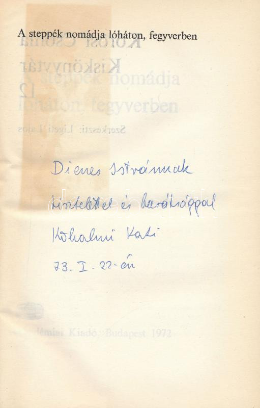 U. Kőhalmi Katalin: A steppék nomádja lóháton, fegyverben. A Körösi Csoma Kiskönyvtár sorozat 12. része. Bp., 1971, Akadémiai Kiadó. Első kiadás. Fekete-fehér illusztrációkkal. Kiadói papírkötés, a borítón.