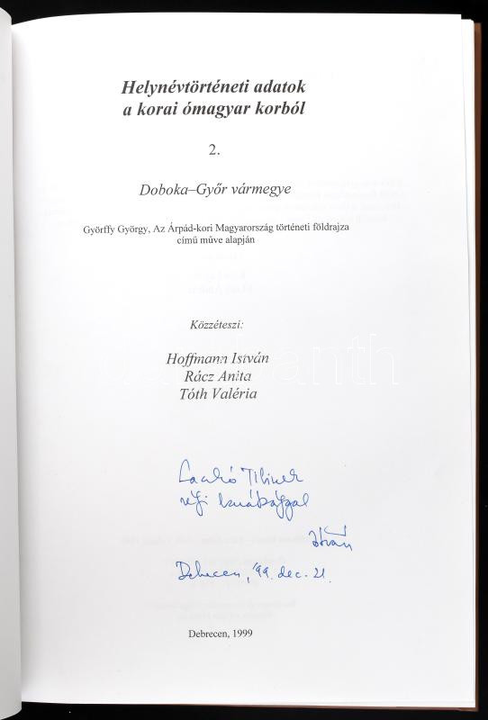 Helynévtörténeti adatok a korai ómagyar korból. 2.:Doboka -Győr vármegye. Györffy György, Az Árpád-kori Magyarország történeti földrajza című műve alapján. Közzéteszi: Hoffmann István, Rácz Anita, Tóth Valéria. Az egyik közzétevő, Hoffmann István által DEDIKÁLT példány. Magyar Névarchivum kiadványai 3. Debrecen, 1999., Magyar Névarchivum. Kihajtható térképekkel illusztrált példány. Kiadói kartonált papírkötés.
