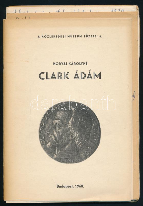 Horváth Károlyné: Clark Ádám. Közlekedési Múzeum Füzetei 4. Bp., 1968., Közlekedési Múzeum Füzetei. Kiadói papírkötés. Megjelent 2000 példányban. Benne Dienes István (1929-1995) régész, muzeológus jegyzeteivel papírlapokon.