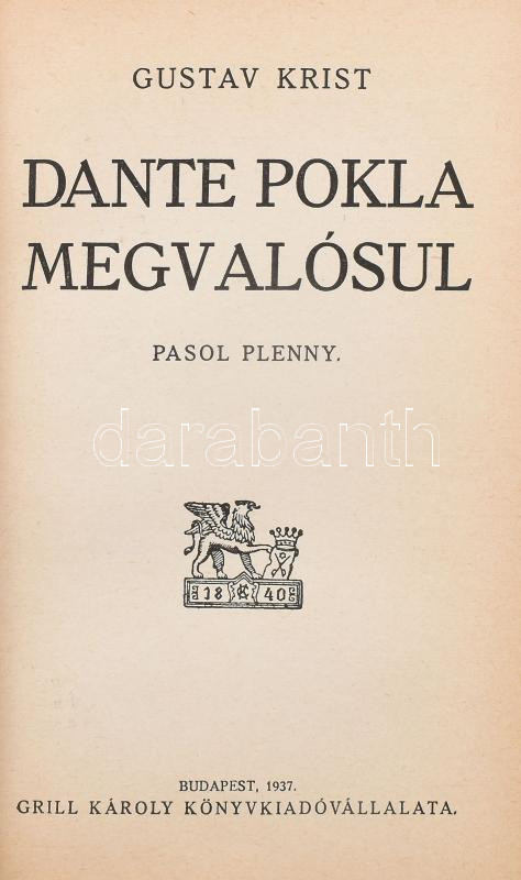 Krist, Gustav: Dante pokla megvalósul. Pasol plenny. Ford. Berend Miklósné. Bp., 1937. Grill. Átkötött kopott egészvászon-kötésben