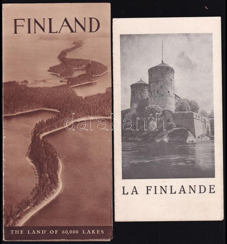 cca 1930 Finnország prospektusok, 2 db: Finland. The land of 60,000 lakes. Helsinki, Otava Publishing, gazdag fekete-fehér képanyaggal illusztrált, angol nyelven.; La Finlande. Francia nyelvű prospektus, fekete-fehér képanyaggal. Helsinki, 1930., Valtioneuvoston Kirjapaino.;