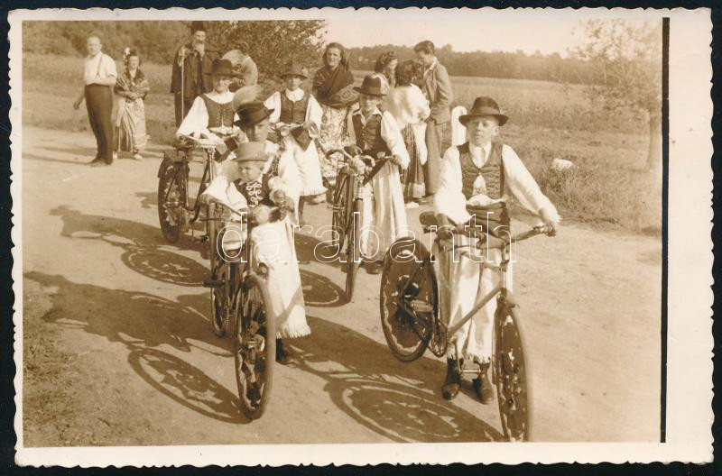 1949 Szüreti mulatságra igyekvő gyerekek népviseletben, biciklivel Mez... https://www.darabanth.com/de/435-Fernauktion/435.0/Fotografie/Foto~500022/1949-Szureti-mulatsagra-igyekvo-gyerekek-nepviseletben-biciklivel-Mezokovesd-videken-hato~II2821025