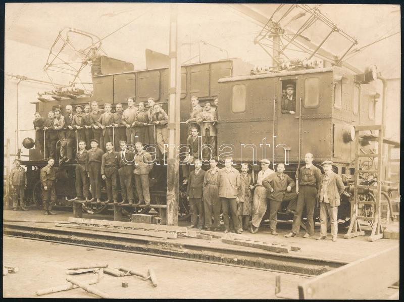 cca 1920 Dolgozók mozdonnyal szerelőműhelyben, fotó, 11,5×15 cm https://www.darabanth.com/de/435-Fernauktion/435.0/Fotografie/Foto~500022/cca-1920-Dolgozok-mozdonnyal-szerelomuhelyben-foto-11-5C39715-cm~II2819496