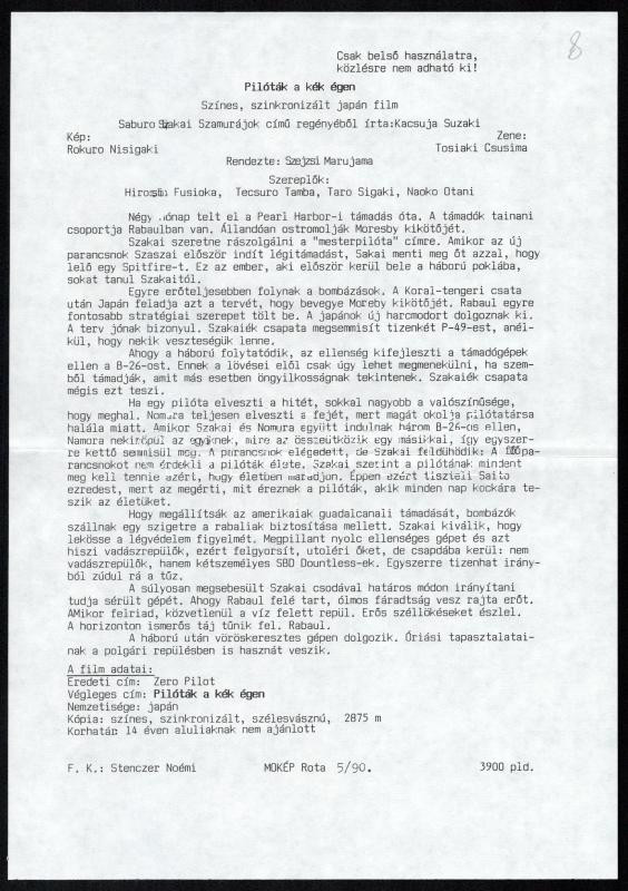cca 1976 ,,Pilóták a kék égen" című japán film jelenetei és szereplői, 8 db produkciós filmfotó nyomdatechnikával sokszorosítva, karton lapra, egyoldalas nyomtatással, + hozzáadva a filmet ismertető leírást, 18x24 cm