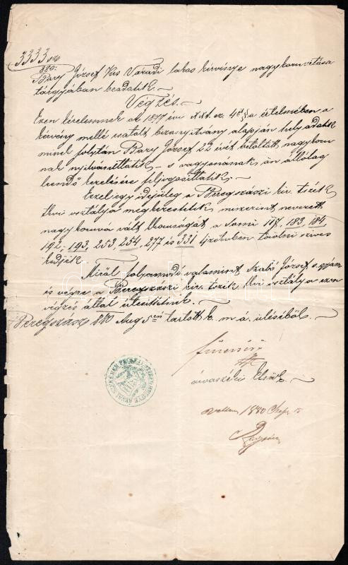 1880 Beregszász, Dr. Bary József (1858-1915) későbbi m. kir. kúriai bíró, a tiszaeszlári vérvádper vizsgálóbírójának nagykorúsítási kérelme, korabeli másolat, pecséttel, szakadt.