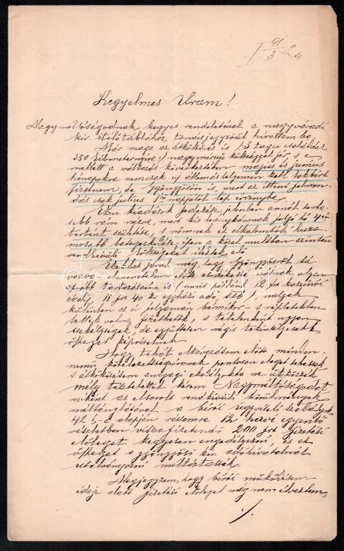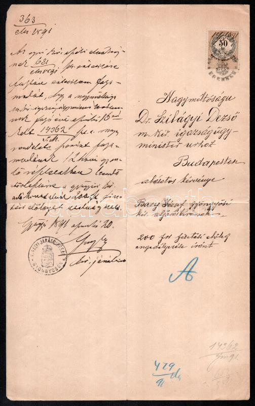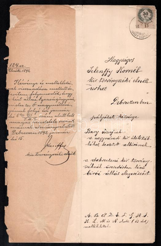 Beschreibung: 1891 Nagyvárad, Gyöngyös, Dr. Bary József (1858-1915) albÃró/királyi eljárásbÃró, a tiszaeszlári vérvádper vizsgálóbÃró megüresedett bÃró állásra való jelentkezése, és fizetési elÅ‘leg kérelme, autográf aláÃrásokkal, 2 db 50 kr okmánybélyeggel.
