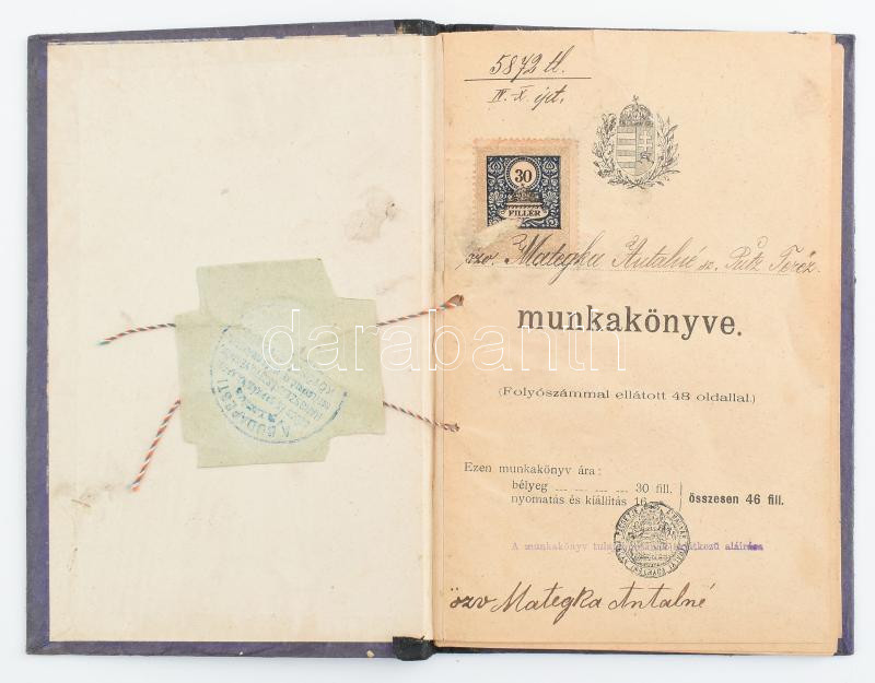 1904 Bp., Munkakönyv segédmunkásnő számára https://www.darabanth.com/de/435-Fernauktion/435.0/Kunst-Dokumente-andere-Sammelgebiete/Dokument~500019/1904-Bp-Munkakonyv-segedmunkasno-szamara~II2823029