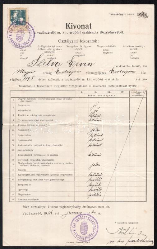 Beschreibung: 1914 Vadászerdő, kivonat a m. kir. erdőőri szakiskola törzskönyvéből, okmánybélyeggel