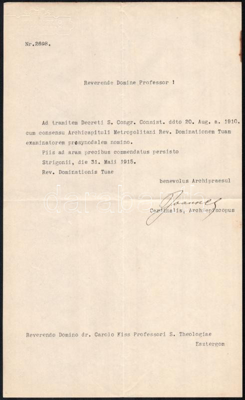 Beschreibung: 1915 Csernoch Károly (1852-1927) bíboros latin nyelvű irata Kiss Károly teológia professzor részére saját kezű aláírásával, hajtva