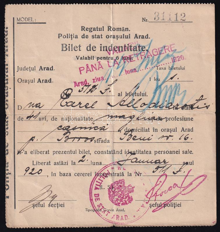 1920 Aradi azonosítási igazolvány https://www.darabanth.com/de/435-Fernauktion/435.0/Kunst-Dokumente-andere-Sammelgebiete/Dokument~500019/1920-Aradi-azonositasi-igazolvany~II2822486